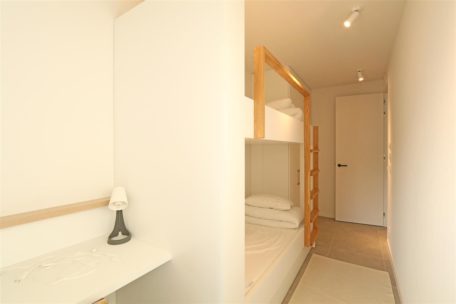 Appartement neuf et moderne avec une chambre double disposant d’une salle de bains attenante avec lavabo, douche à l’italienne et toilettes. Il y a une deuxième chambre avec un lit superposé et un bureau, ainsi qu’une deuxième salle de douche.