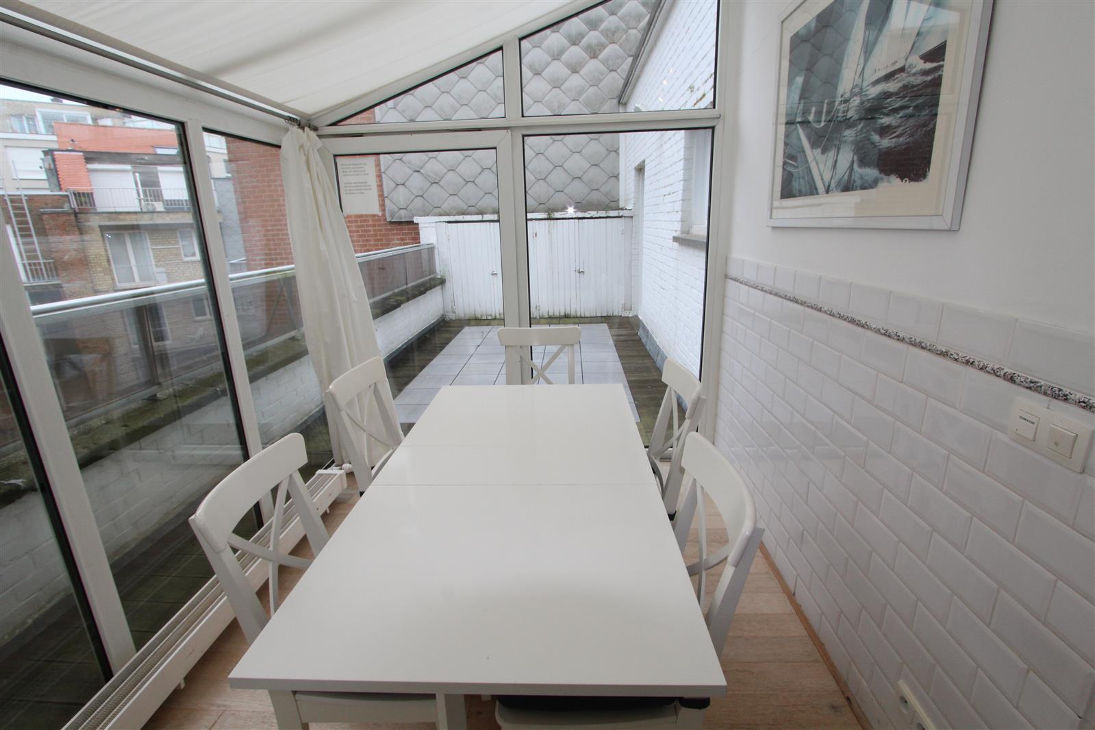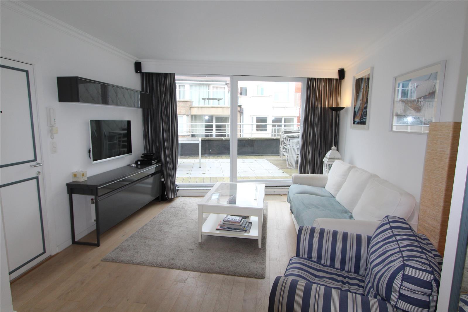 Deze gezellige penthouse bevindt zich in de buurt van het Albertplein en beschikt over een groot terras vooraan waar u kan genieten van een uitgestrekt zijdelings zeezicht. Garagebox inbegrepen.